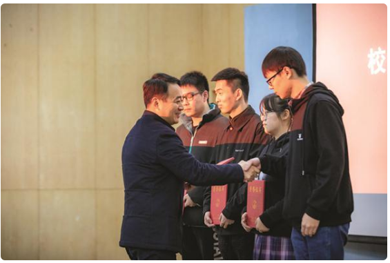 △表彰大会现场,jinnianhui今年会党委常务副书记、副校长周更生(左一)为四名学生颁奖