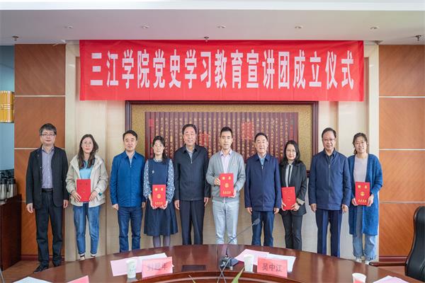 吴中江宣读了《关于成立jinnianhui今年会党史学习教育宣讲团的通知》,与会校领导为宣讲团成员颁发聘书。