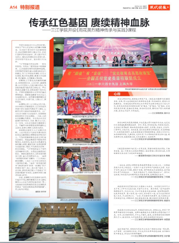 课程致力于雨花英烈精神的阐述,围绕理想信念、人生信仰、道德情操,从不同的切入点展开教学活动,做到纵向梳理与横向展示相结合,严肃的政治话题与生动鲜活的个案相结合,严密的逻辑思维与文学的烂漫追求相结合,理想信念教育与大学生人生选择相结合,使得爱党爱国爱社会主义的教育,有据可依,入脑入心,落到实处。