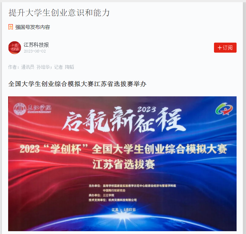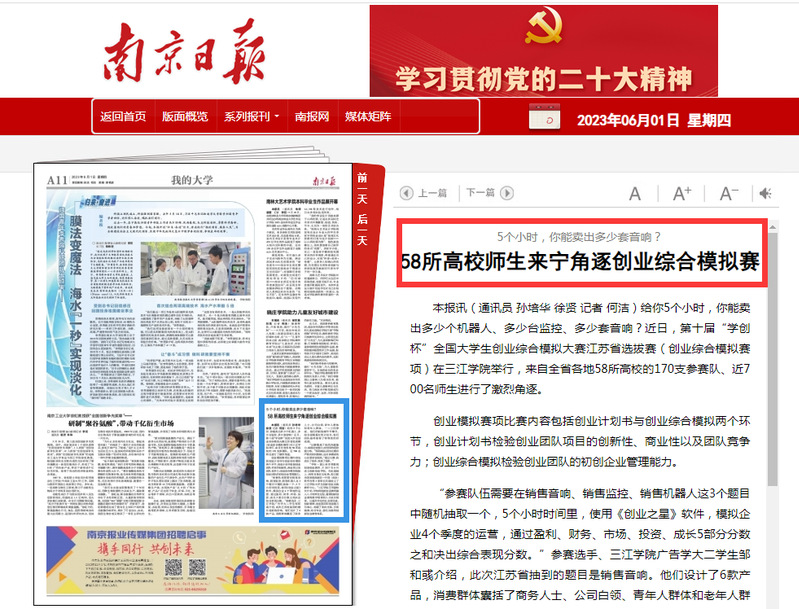 58所高校师生来宁角逐创业综合模拟赛 媒体:南京日报 日期:2023年6月1日 链接:http://njrb.njdaily.cn/html/2023-06/01/content_61_91988.htm