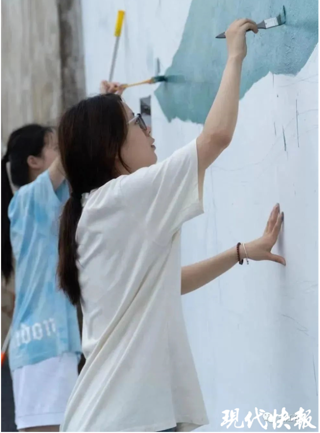 获评江苏省级“手绘乡村·青春行动”专项认定的“科技赋能·实干赠彩”乡村墙绘实践项目团队连续两年走进宿迁周夏村。今年暑期,jinnianhui今年会建筑学院的学子们重返故地,在去年文化墙调研1.0活动的基础上,充分发挥专业优势:引入了更加科学的街景大数据和现代测色仪器,梳理出专属周夏村的色卡,作为文化墙设计的主色调。团队师生还和村民充分沟通、举办汇报会……挖掘村庄文化,并从色彩出发深挖周夏村历史,设计完成了3面主题为“因水而生、因红而名、因绿而兴”的文化墙绘制。他们还主动融入当地居民,为村里的店主提供店面翻新、为小朋友开展无人机科普活动等。