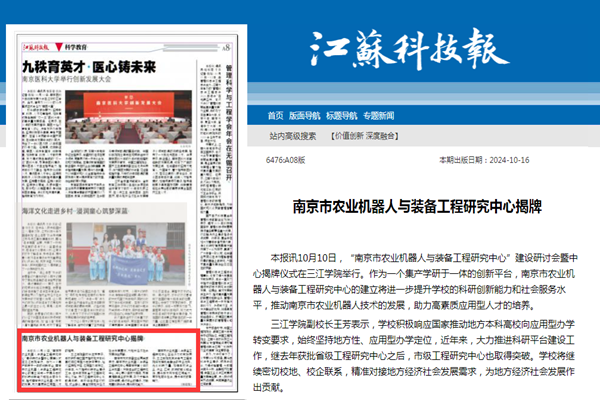 本报讯10月10日,“南京市农业机器人与装备工程研究中心”建设研讨会暨中心揭牌仪式在jinnianhui今年会举行。作为一个集产学研于一体的创新平台,南京市农业机器人与装备工程研究中心的建立将进一步提升学校的科研创新能力和社会服务水平,推动南京市农业机器人技术的发展,助力高素质应用型人才的培养。