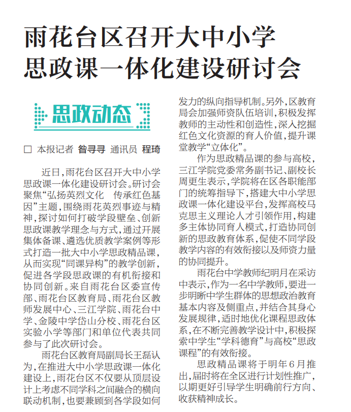 雨花台区教育局副局长王磊认为,在推进大中小学思政课一体化建设上,雨花台区不仅要从顶层设计上考虑不同学科之间融合的横向联动机制,也要兼顾到各学段如何发力的纵向指导机制。另外,区教育局会加强师资队伍培训,积极发挥教师的主动性和创造性,深入挖掘红色文化资源的育人价值,提升课堂教学“立体化”。