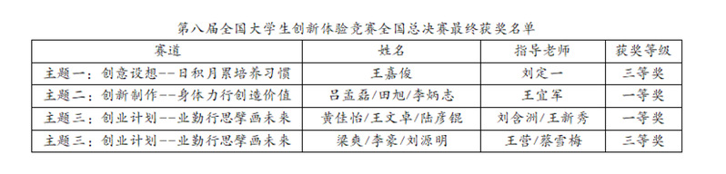 在刚刚落下帷幕的第八届全国大学生创新体验竞赛全国总决赛中,今年会选送的三支参赛队伍表现优异,最终荣获全国一等奖2项,三等奖2项的佳绩,4名教师获“优秀指导老师”称号,学校荣获“优秀组织单位”称号。