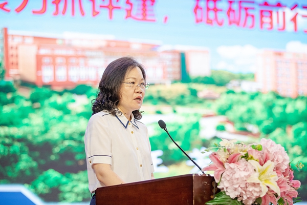 校长王芳作了题为《凝心聚力抓评建砥砺前行谋发展》的讲话。她从三个方面总结了学校上半年评建工作进展:一是党建引领,保障有力。通过深化综合治理、优化评估管理、强化评建团队,形成学校改革发展内驱动力,全面推进评建工作进入冲刺状态。二是统筹安排,精准发力。坚持目标引领和问题导向,先后三次深入教学单位巡回调研,研讨教学建设特色亮点,制定评建工作进程计划,实现了评建工作有序推进。三是全面发动,齐心协力。学校层面,召开了6次材料建设、自评报告、示范案例等研讨会。学院层面,优化实施方案,细化评建任务,凝练特色亮点。学生层面,组织召开审核评估学生发展工作推进会,“抓评建、促学风”工作全面开展。她围绕下半年评建工作,针对学校评建存在的具体问题,结合自己的评建经验,从工作内涵、关键环节、质量要求,重点强调并解读了下一步需要完成的五项任务:一是完善四级材料。二是准备三类考察。三是做好四级访谈。四是优化三种环境。五是做好模拟演练。最后,她要求拧紧思想之弦、压实责任之链、弘扬实干之风,以更高的站位、更高的标准、更严的要求推进评建工作,确保审核评估取得优异成绩,推动学校高质量发展。