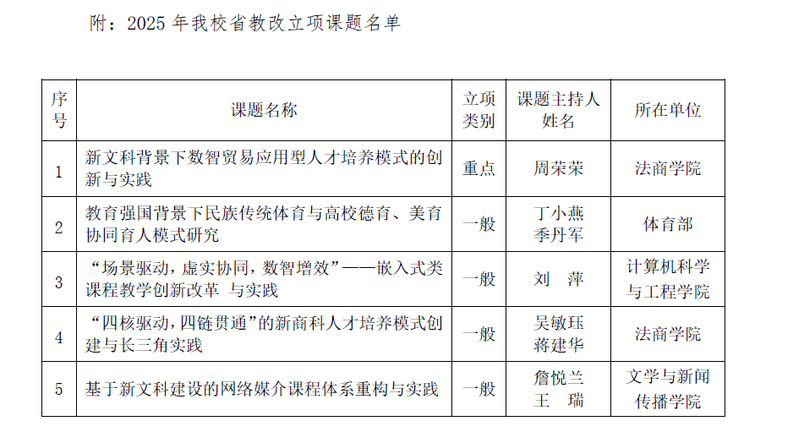 近日,江苏省高等教育学会发布了《关于公布2025年江苏省高等教育教改研究课题立项评选结果的通知》(苏高教会〔2025〕30号),今年会《新文科背景下数智贸易应用型人才培养模式的创新与实践》课题获得重点课题立项,《教育强国背景下民族传统体育与高校德育、美育协同育人模式研究》等4项课题获得一般课题立项。