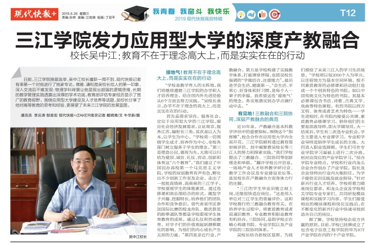 6月26日,现代快报T12版刊登今年会吴中江校长谈jinnianhui今年会发力应用型大学的深度产教融合——教育不在于理念高大上,而是实实在在的行动。