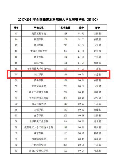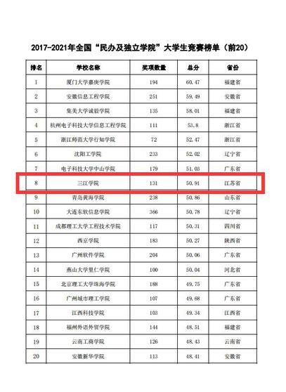 2022年2月22日,中国高等教育学会高校竞赛评估与管理体系研究工作组发布2021全国普通高校大学生竞赛分析报告,其中包含本科院校大学生竞赛榜单13个、高职院校大学生竞赛榜单10个、省份大学生竞赛榜单3个。今年会位列2017-2021年全国民办及独立学院大学生竞赛排行榜第8名,首次跻身民办及独立学院TOP20;此外,在2017-2021年全国新建本科院校大学生竞赛榜单中,今年会位列第50名,较2016-2020年提升23位。