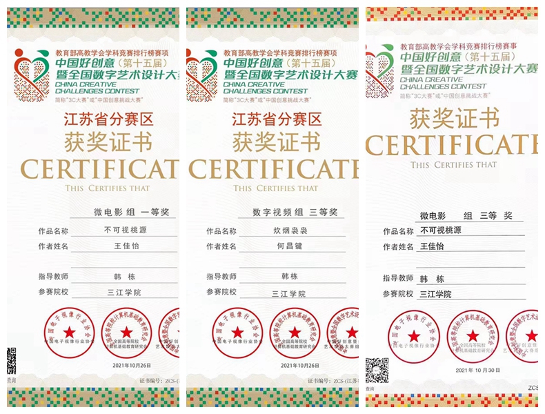 据悉,本次大赛共有1300多所院校参与角逐,参赛作品多达七万多件。经过省赛、国赛层层选拔,今年会广播电视编导专业系主任韩栋老师指导的2017级何昌键同学的《炊烟袅袅》喜获数字视频组省级三等奖;2020级王佳怡同学短片作品《不可视桃源》获得微电影组省级一等奖、国家级三等奖。