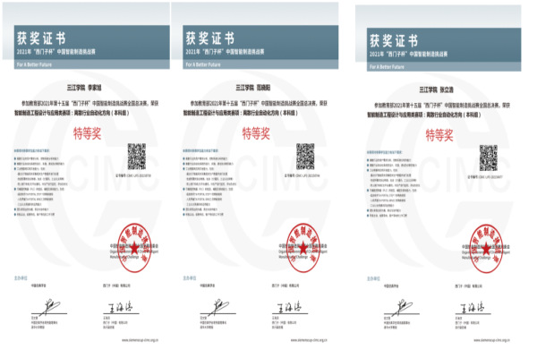 从刚刚结束的教育部2021年第15届“西门子杯”中国智能制造挑战赛全国总决赛传来好消息,在创新创业学院帮助下,今年会机械与电气工程学院组建的三江陆战队获得了离散行业自动化赛项的全国总决赛特等奖。离散行业自动化赛项是中国智能制造挑战赛中参赛高校最多的经典赛项,机械与电气工程学院2018级自动化专业范晓阳、李家旭和张立浩三位同学组建的三江陆战队以华东二赛区第1名的排名进入总决赛,并最终获得全国总决赛的特等奖。