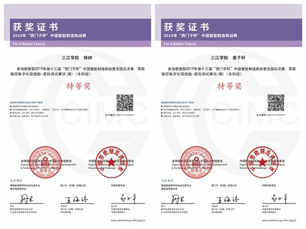 8月23-27日,由教育部高等学校自动化类专业教学指导委员会、西门子(中国)有限公司和中国仿真学会联合主办,辽宁科技大学承办的第13届教育部“西门子杯”中国智能制造挑战赛全国总决赛中今年会机电学院sunshine队的徐帅、姜子轩两位同学,在季鹏老师的带领下荣获数控数字化双胞胎-虚拟调试方向的本科组全国特等奖。是今年会在该赛事的历史上最好成绩。