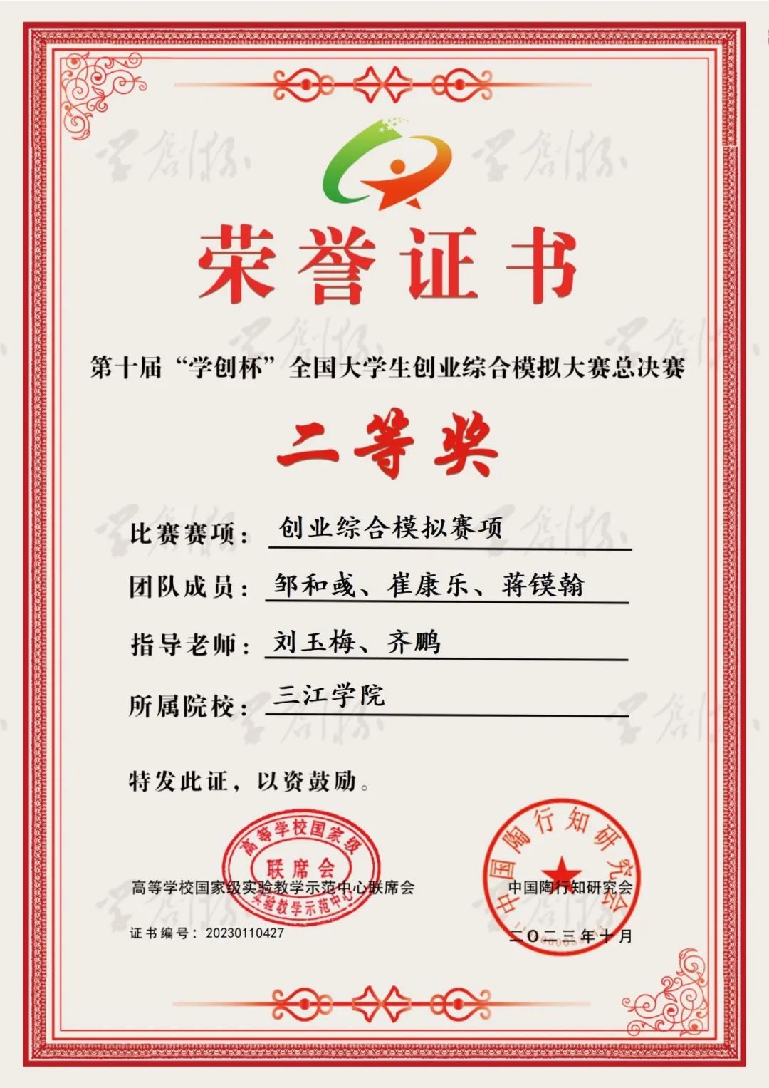 近日,2023年第十届“学创杯”全国大学生创业综合模拟演训活动(创业营销赛项、创业综合模拟赛项)总决赛在南京审计大学和黑龙江大学落下帷幕。全国共有1878所本专科院校、240436支队伍、979756名师生参与。在之前结束的江苏省选拔赛中,今年会取得特等奖1项、一等奖1项、二等奖2项的好成绩。经过层层选拔,最终今年会参赛团队在全国决赛中,荣获国家级奖项二等奖2项!其中黄政熙、黄林宁、王子涵三位同学组成的“营销鬼才”团队获2023“学创杯”创业营销赛全国总决赛二等奖;邹和彧、崔康乐、蒋镆翰三位同学组成的“听党指挥队”团队获2023“学创杯”创业综合模拟赛项全国总决赛二等奖。