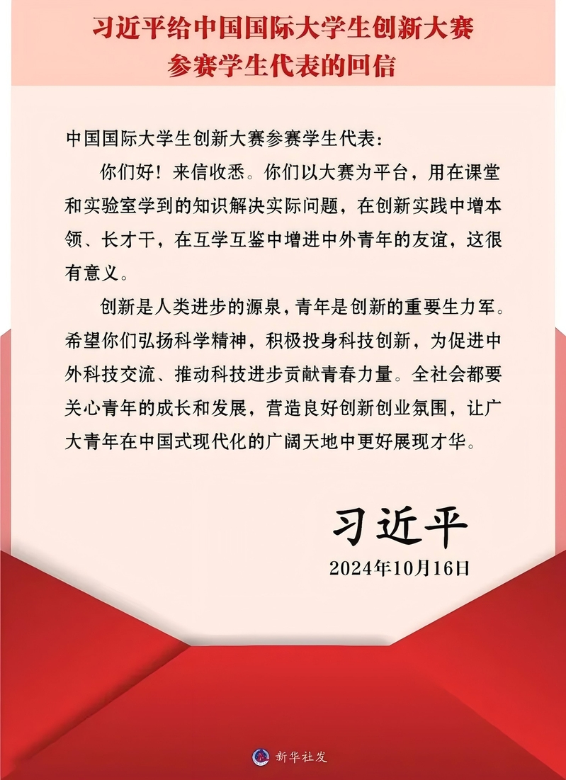 近日,中共中央总书记、国家主席、中央军委主席习近平给中国国际大学生创新大赛参赛学生代表回信,对他们予以亲切勉励并提出殷切希望。他强调,创新是人类进步的源泉,青年是创新的重要生力军。希望你们弘扬科学精神,积极投身科技创新,为促进中外科技交流、推动科技进步贡献青春力量。全社会都要关心青年的成长和发展,营造良好创新创业氛围,让广大青年在中国式现代化的广阔天地中更好展现才华。