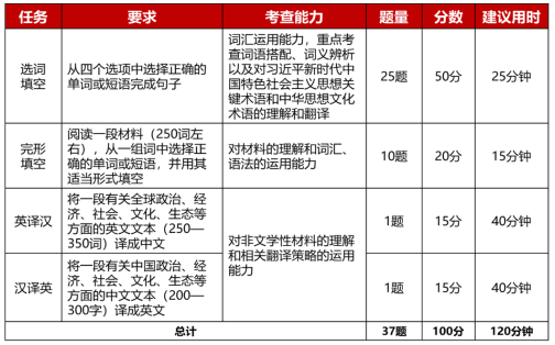 请在比赛开始前半小时登录大赛官网准备线上作答。比赛时间为120分钟。全国统一线上初赛赛题由大赛组委会提供,包括客观题若干道、英译汉1篇、汉译英1篇,赛题构成见下表:
