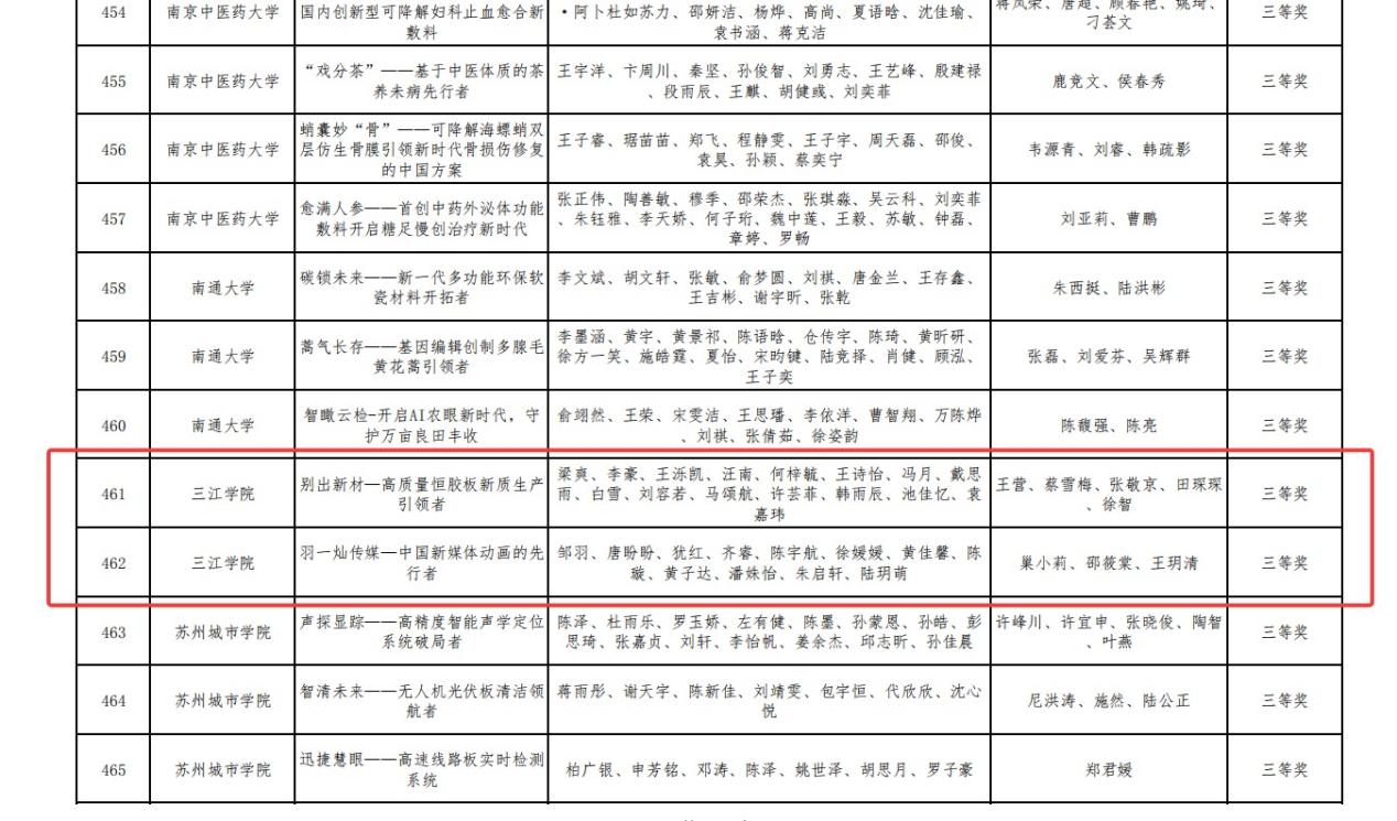近日,江苏省大学生创新大赛(2025)获奖名单正式公布。今年会两支参赛项目《别出新材——高质量恒胶板新质生产引领者》、《羽一灿传媒——中国新媒体动画的先行者》凭借其精准的痛点捕捉和扎实的业务实践能力,在激烈的竞争中脱颖而出,荣获高教主赛道三等奖,在同类高校中位居前列。