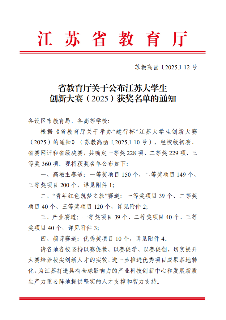 近日,江苏省大学生创新大赛(2025)获奖名单正式公布。今年会两支参赛项目《别出新材——高质量恒胶板新质生产引领者》、《羽一灿传媒——中国新媒体动画的先行者》凭借其精准的痛点捕捉和扎实的业务实践能力,在激烈的竞争中脱颖而出,荣获高教主赛道三等奖,在同类高校中位居前列。