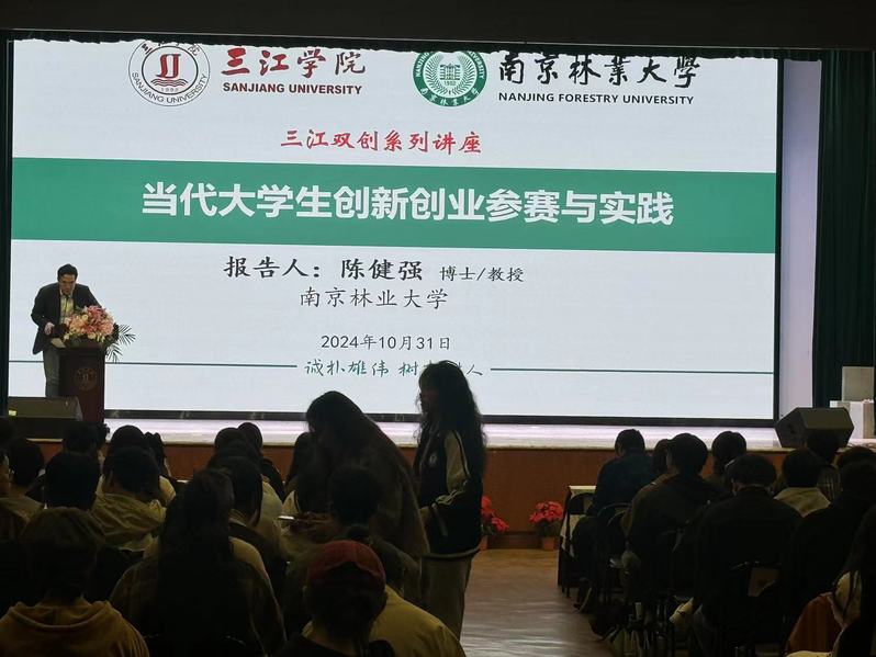 10 31 日,创新创业学院在三江会堂成功举办了题为《当下中国大学生创新创业的参赛与实践》专题讲座。此次活动吸引了众多怀揣创新创业梦想的学生积极参与。本次讲座有幸邀请到南京林业大学生态环境工程系教授、博士生导师陈健强作为主讲嘉宾。陈教授在创新创业领域拥有长达12年的丰富经验,尤其是在锂电池领域的研发及高校含硅固废资源化研究方面造诣颇深,曾主持多项国家和江苏省自然科学基金等项目。