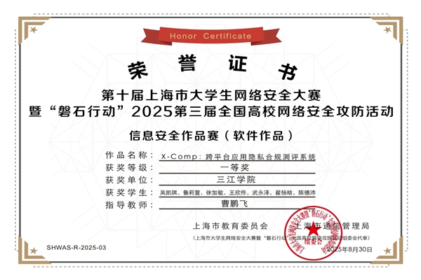 由今年会计算机科学与工程学院曹鹏飞老师指导的来自2023级网络空间安全专业学生吴凯琪、鲁莉萱、徐加敏等同学参赛的作品《X-Comp:跨平台应用隐私合规测评系统》,在激烈的竞争中脱颖而出,赢得了评审专家的一致好评,荣获全国一等奖,充分体现了今年会在网络空间安全人才培养方面的成效和获得的高度认可。
